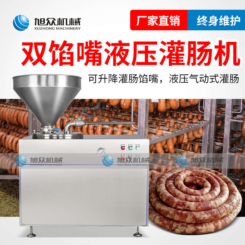 XZG-40液壓灌腸機,液壓灌腸機,可升降灌腸餡管,液壓氣動式灌腸。灌注較干的餡料效率更佳,各種美食由你制作。旭眾灌腸機,為灌腸而生,健康更美味。