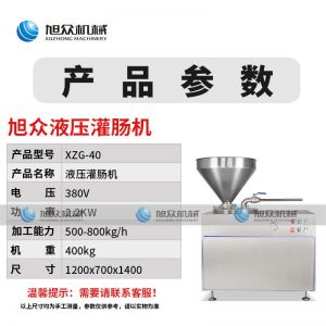 名稱XZG-40液壓灌腸機 電源380V 功率2.2KW 產量500800kg/h 尺寸1200X700X1400m 重量400kg 規格聯系銷售員 其他