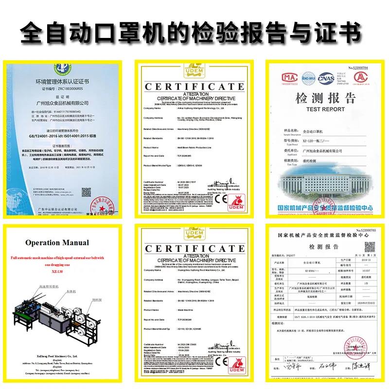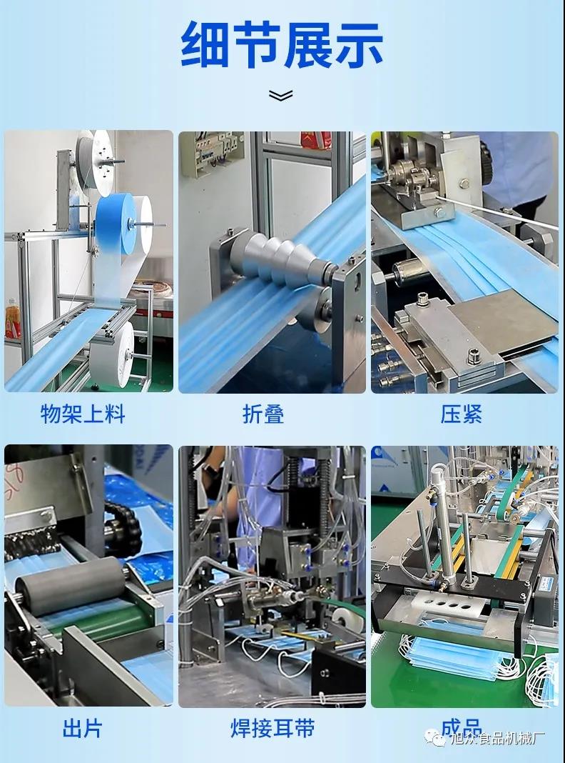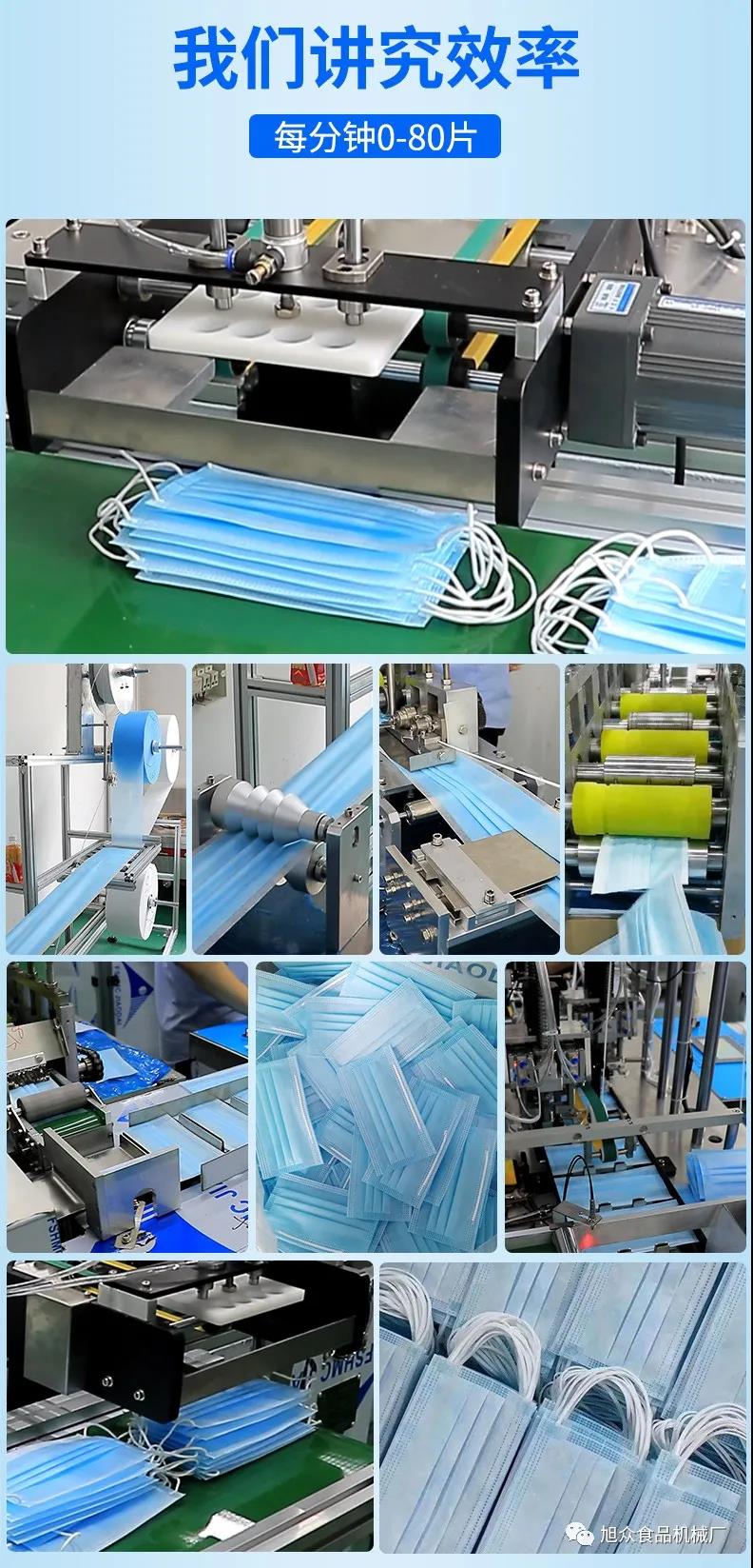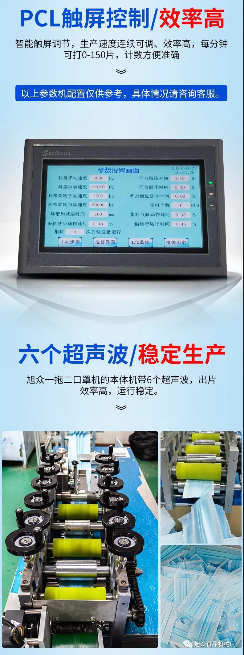 旭眾牌一拖二口罩機由一臺本體機帶動兩臺耳帶機組成。本體機輸出ロ罩本體后,由輸送帶結構將口罩本體片輸送到連接耳帶機的輸送帶上,再通過輸送帶將口罩片輸送到耳帶機的正面第一個口罩盤上方,最后通過氣缸下壓把口罩片放置到耳帶機的口罩盤內,后續由耳帶機完成口罩的耳帶熔接,包邊等動作,從而完成一個耳帶口罩產品的生產。本機采用PLC、觸摸屏控制、主傳送帶采用單相馬達輸送、步進馬達翻轉,傳動精確,控制穩定,速度可調。